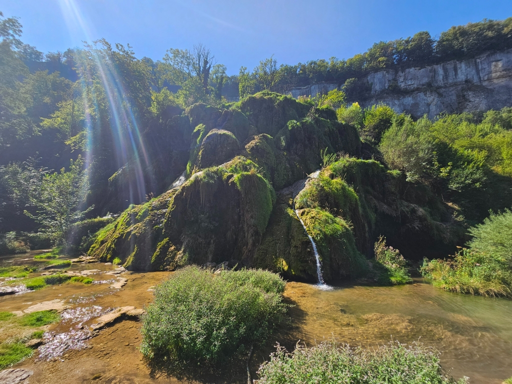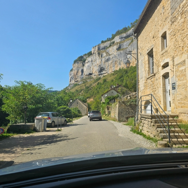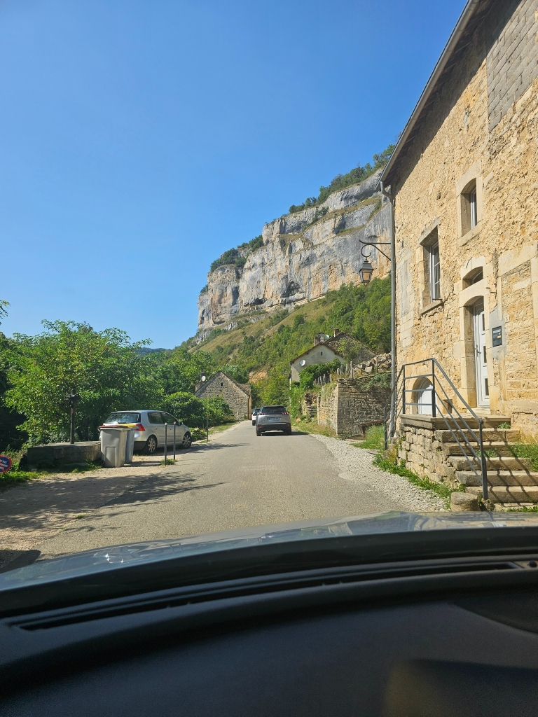 From there, we drove on to Baume-les-Messieurs, tucked deep into a valley. The descent alone is memorable. Surrounded by steep rock walls, this small village feels almost hidden. An ancient abbey, caves, towering cliffs and a waterfall all coexist in a surprisingly compact space.